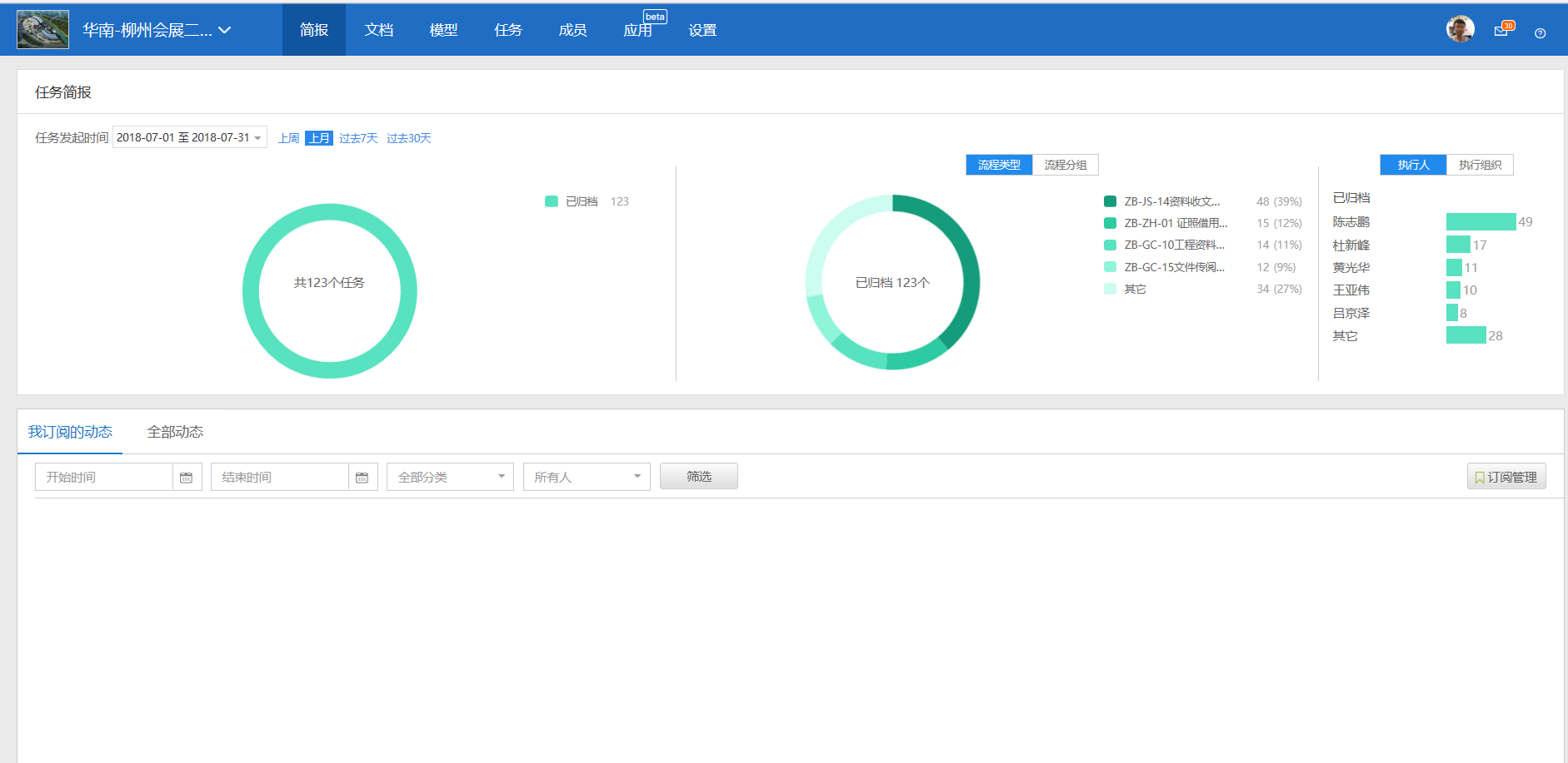 同时基于各方之间的业务流程也均在平台上处理, 传统模式下, 项目之间的流程处理均通过纸质方式实现, 很多需要并行处理的问题只能串行解决, 而且疲于多头奔波, 四处找人之苦,存在流转资料审批不及时, 不便于监督追踪,而且责任分不清等问题。现在通过互联网的方式使得项目管理工作流程化, 平台化, 使工作由无形变有形, 流程节点上各X作痕迹均有据可查, 工作状态清晰可见, 不受环境和地点的限制, 效率得以大大提升。目前, 平均月处理的流程数量2 0 0 多条, 业务类型涵盖了X,进度, 质量、安全管控等全方面。例如图纸,方案等审核, 分包进场提资, 提交施工方案,每个月度更新工人名单, 会议通知, 分包设备材料进场审批等流程的管理; 项目文件评审类流程使用最为频繁, 尤其是技术、安全、生产三个部门, 线上实现发起任务后, 相关各方协同处理, 审核, 验证, 通过短信、a p p 提醒,第一时间快速响应, 而且任务处理结束后文件自动归档、通过电子签名实现了无纸化办公,效率显著提升。“ 工作方法流程体现, 工作任务任务体现, 工作状态以任务完成情况体现,工作成果文档体现” 的思路也非常值得借鉴。